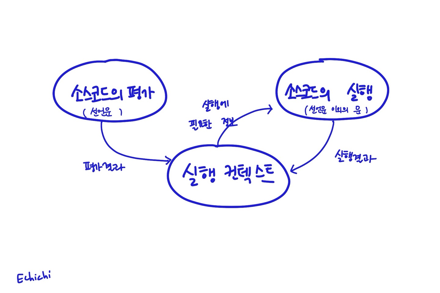 자바스크립트 엔진은 소스코드를 2개의 과정 소스코드의 평가 와 소스 코드의 실행 과정으로 나누어 처리